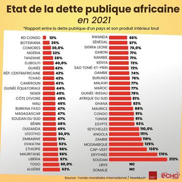 Selon ce tableau du Fonds monétaire international (FMI) sur la dette publique africaine, notamment le rapport entre la dette publique d’un pays et son Produit intérieur brut (PIB), la RDC est le pays le moins endetté d’Afrique.