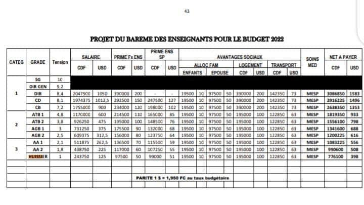 Une feuille de route a été débattue, mieux un projet de barème a été adopté et sera soumis au Gouvernement par les participants dont les délégués de la Présidence de la République, de la Primature, du Gouvernement, de la Société Civile, des syndicalistes nationaux et provinciaux venus de l’arrière-pays, sans oublier les enseignants de quelques écoles phares de Kinshasa. ce projet prévoit payer de payer 398 USD à un huissier, et 1 583 USD à un directeur.