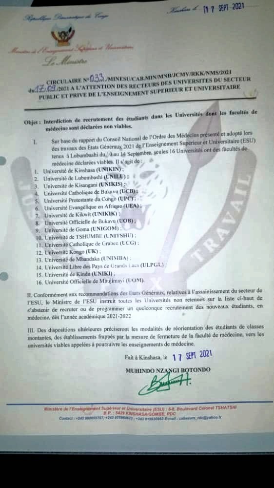 Le ministre de l’Enseignement supérieur et universitaires (ESU) a publié, vendredi 17 septembre 2021, la liste de 16 universités, jugées viables pour organiser cette filière en RDC.