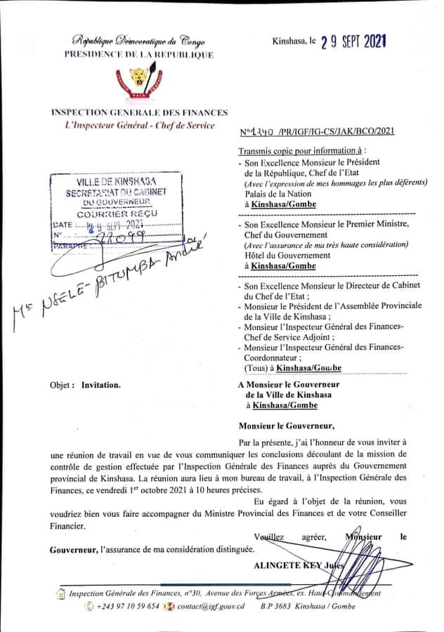 « J’ai l’honneur de vous inviter à une réunion de travail en vue de vous communiquer les conclusions découlant de la mission de contrôle de gestion effectué par l’Inspection générale des Finances auprès du gouvernement provincial de Kinshasa », écrit Jules Alingete à Gentiny Ngobila, dans une correspondance datée du 29 septembre courant, accusé de réception faisant foi.