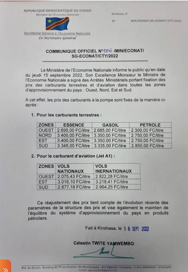 Le litre d’essence à la pompe connaitra ce week-end une augmentation 200 Francs congolais à Kinshasa, soit environ 0,1 dollar américain et se vendra à 2.695 FC. C’est ce qui ressort du présent communiqué officiel, émanent du Secrétaire général à l’Economie nationale.