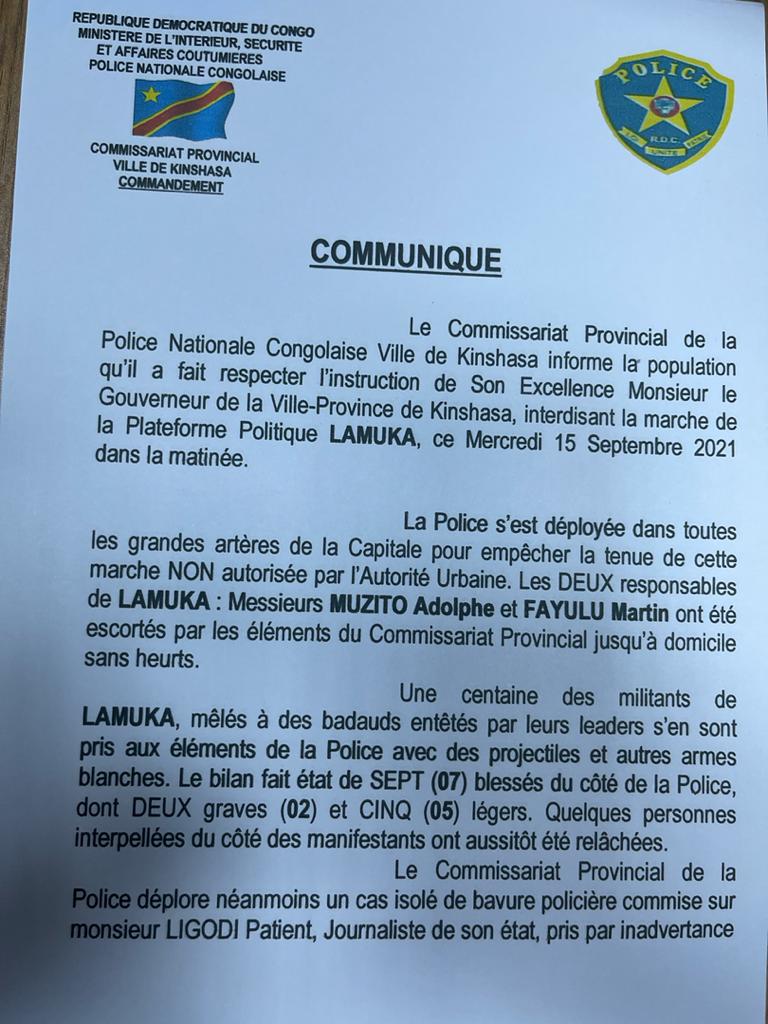 Dans un communiqué officiel, le commissaire provincial de la Police nationale congolaise ville de Kinshasa, par la bouche de son commissaire divisionnaire adjoint Sylvano Kasongo, dit avoir respecté les instructions du Gouverneur de la ville, interdisant la marche de Lamuka ce mercredi 15 septembre 2021.