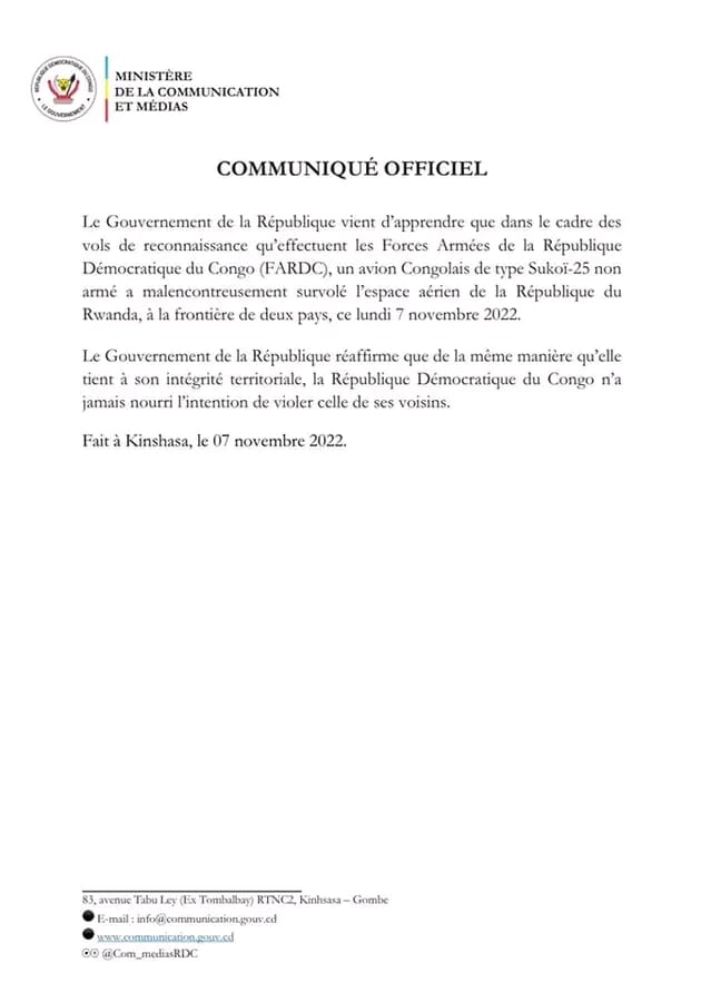 Faux, rétorque le ministre congolais de la Communication et Médias. » Le gouvernement de la République réaffirme que de la même manière qu’elle tient à son intégrité territoriale, la République démocratique du Congo n’a jamais nourri l’intention de violer celle de ses voisins », peut-on lire dans un communiqué.