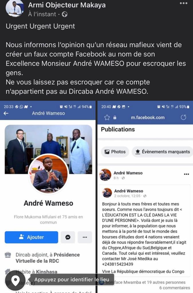 Un réseau mafieux vient de créer un faux compte Facebook intitulé André Wameso (voir image). A lire quelques publications sur ledit compte, dans une langue qui ressemble au français plein d’incohérences et sans compter les fautes d’orthographe, ce qui ne rime pas avec la plume bien taillée de ce digne fils Ne-Kongo, il s’agit ni plus ni moins d’une initiative d’escrocs, une campagne de sape contre celui sur qui repose la confiance du Président de la République. Les avertis le savent si bien ; le Dircaba Wameso n’est pas distributeur de bourses d’études, comme ils le publient.