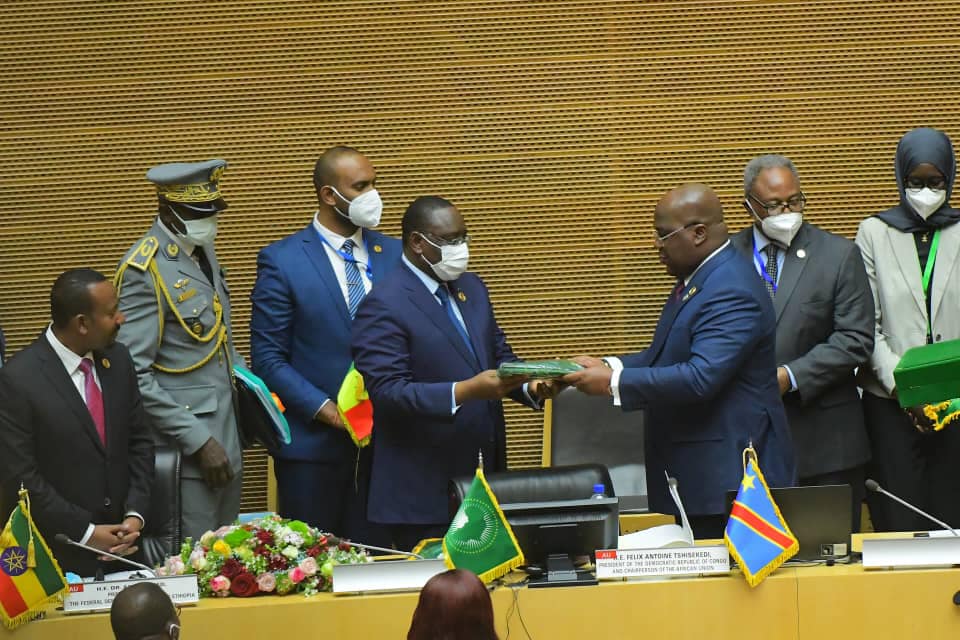 Au cours de la cérémonie d’ouverture du 35ème sommet ordinaire des chefs d’État et de gouvernements de l’Union africaine (UA), ce samedi 5 février 2022 à Addis-Abeba, le Président Felix Antoine Tshisekedi a cédé le fauteuil de la présidence tournante de l’organisation panafricaine à son successeur Macky Sall du Sénégal.