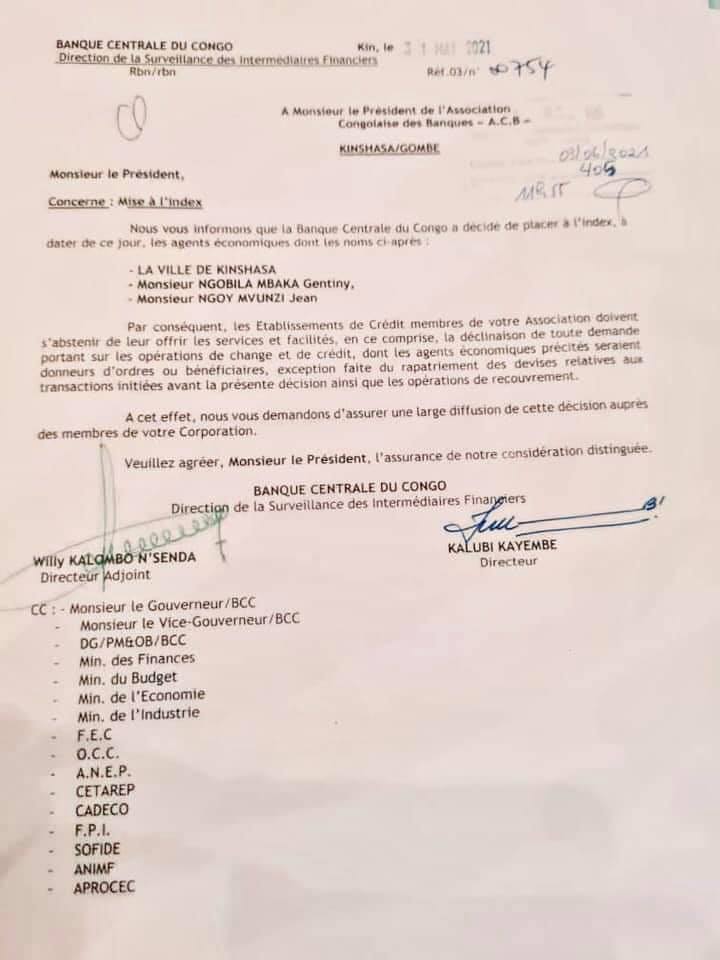 La direction de la surveillance des intermédiaires financiers de la Banque centrale du Congo (BCC)  vient de placer à l’index  la Ville de Kinshasa, M. Gentiny Ngobila ainsi que M. Ngoy Mvuzi Jean. Une mauvaise nouvelle pour le Gouverneur de la ville capitale dans tous les viseurs ces derniers temps.