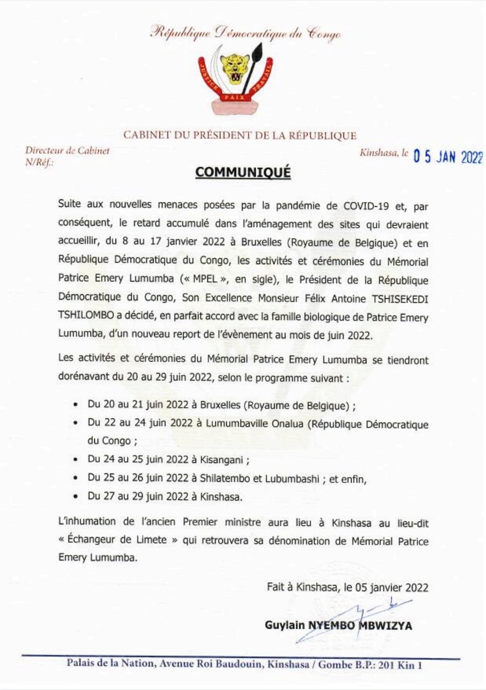 Initialement prévues du 8 au 17 janvier courant, les activités et cérémonies du Mémorial Patrice Emery Lumumba (MPEL) viennent d’être à nouveau reportées. A en croire Guylain Nyembo, Directeur de cabinet de Félix Tshisekedi qui signe le communiqué y relatif, la Covid 19 est à la base de ce report. D’ores et déjà, ces activités sont renvoyées du 20 au 29 juin prochain.