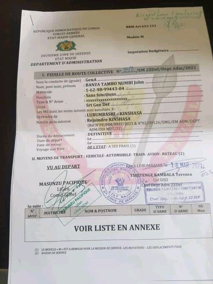 Une feuille de route datée du 18 mars, émanant de l’Etat-major général, Département d’administration, intime l’ordre au Général Banza Tambo Numbi John, sans fonction, de se rendre de Lubumbashi à Kinshasa. Un déplacement à durée définitive, aux frais de l’Etat. Et la suite, on l’imagine déjà…