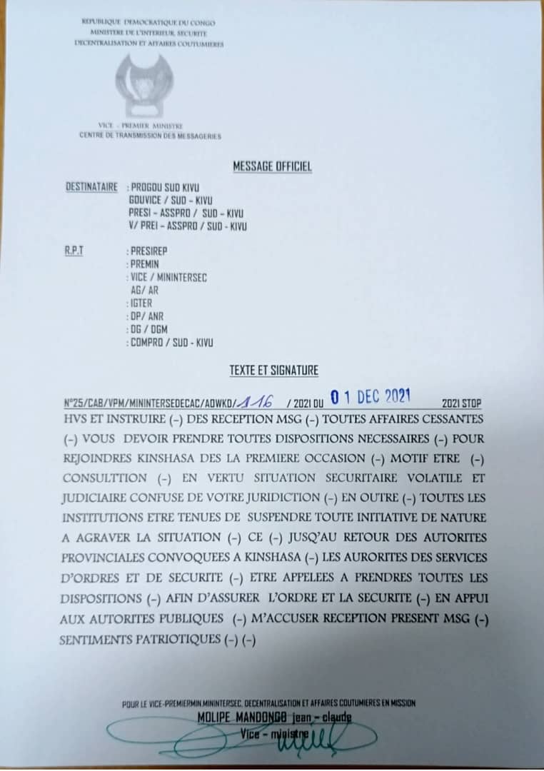 C’est ce qui ressort d’un message officiel daté de ce mercredi 1er décembre 2021, signature du vice-ministre à l’Intérieur faisant foi.