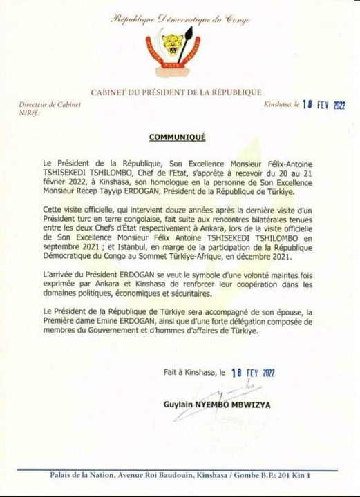 Outre le président, la délégation turque sera composée de Mme Emine Erdogan, son épouse, ainsi que de plusieurs membres du gouvernement et hommes d’affaires de ce pays ami à la République démocratique du Congo.