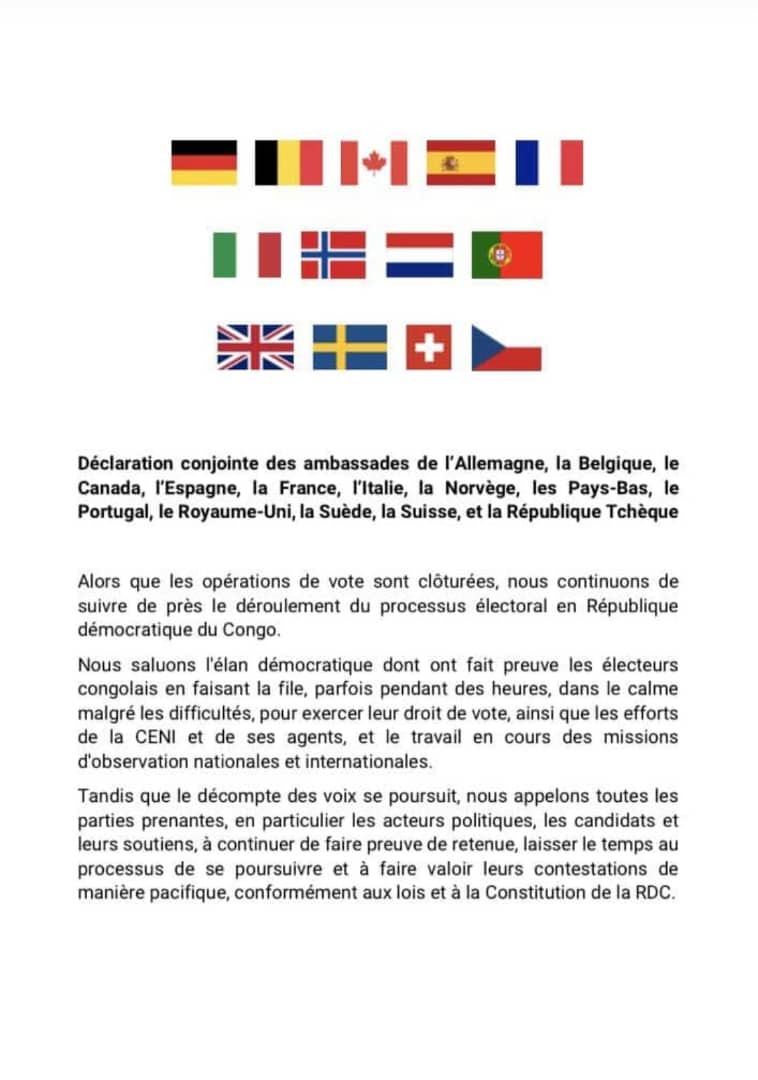 Dans une déclaration conjointe, 13 pays occidentaux saluent le déroulement des élections tenues le 20 décembre en République démocratique du Congo. Il s’agit de l’Allemagne, la Belgique, le Canada, l’Espagne, la France, l’Italie, la Norvège, les Pays-Bas, le Portugal, le Royaume-Uni, la Suède, la Suisse et la République Tchèque.